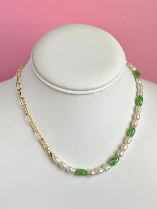 Kiwi Asymmetrical Chain + Pearl Necklace